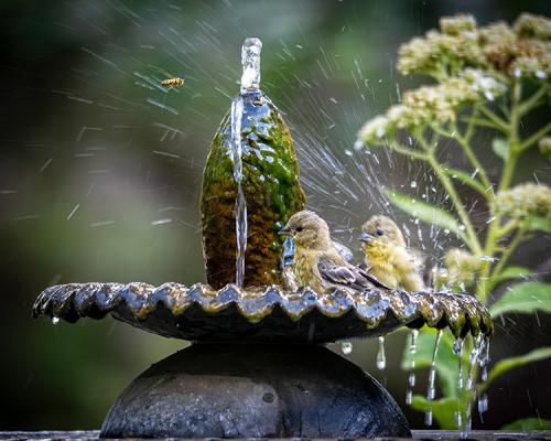 Two young Goldfinches bathing in water fountain